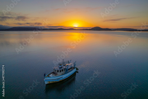 © Merrillie, Naklejka premium Sunrise waterscape with a boat, soft clouds and golden glow