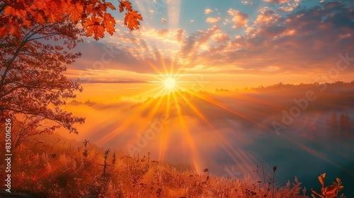 Obraz premium Sunrise with fog rays on a beautiful autumn morning