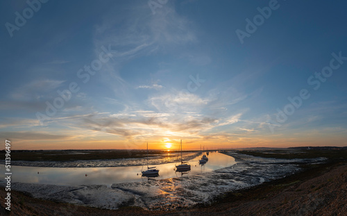 © Stefan K, Naklejka premium Sunrise with sailing boats moored on Mount lake with Hurst lighthouse in the distance with mudflats exposed with the low tide at Hurst spit. Milford on Sea, Hampshire, UK.