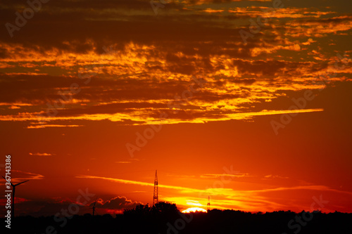 Naklejka premium Sunrise with silhouettes of wind turbines on the horizon