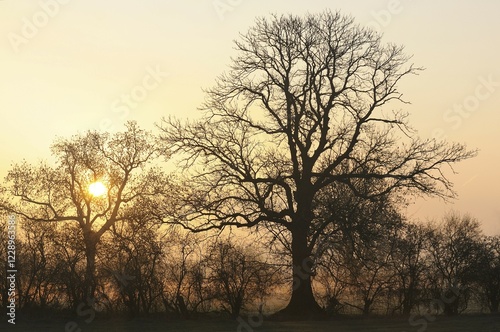 Fototapeta premium Sunrise with trees and fog, Rheinberg, Niederrhein, North Rhine-Westphalia, Germany, Europe