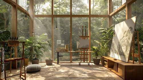 © Anjum, Fototapeta premium Sunroom with a minimalist art corner, large easels, and a forest view