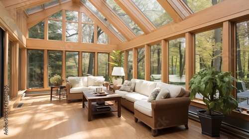 © Salman, Fototapeta premium Sunroom with blonde oak hardwoods and black stained cedar accents.