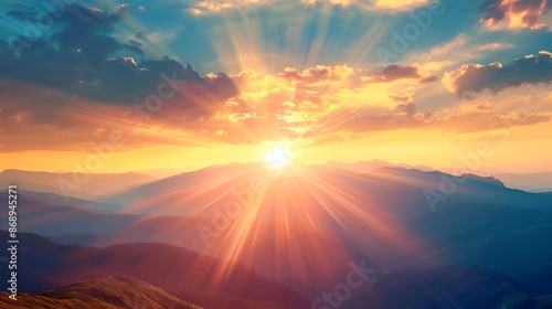 © mahaart, Fototapeta premium Sunset above horizon line with sun setting down behind Caucasian mountains and sun rays. Panoramic view form mountains peak on the bright sunset with clouds. Generative Ai