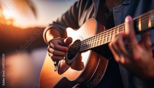 Fototapeta premium Sunset Acoustic Guitarist: A close-up shot of a person's hands delicately...