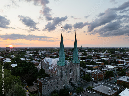 Fototapeta premium Sunset aerial view of church spires over Montreal cityscape. g.