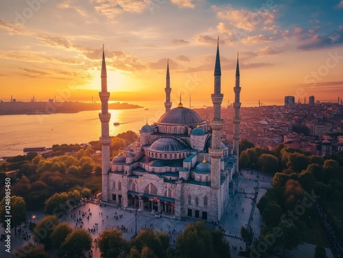 Obraz premium Sunset aerial view of Istanbul's Blue Mosque, cityscape background, tourism