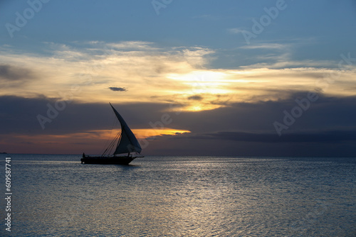© Algimantas, Fototapeta premium Sunset and boats in the sea, sunset on Zanzibar beach
