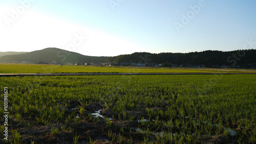 © Stossi Mammot, Fototapeta premium Sunset and rice fields after harvest