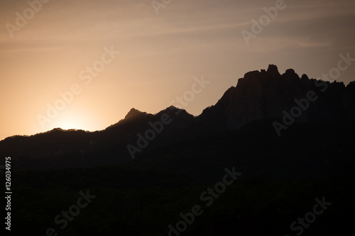 © tuomaslehtinen, Naklejka premium Sunset and silhouette of mountain peaks at the Bukhansan National Park in Seoul, South Korea. Copy space.