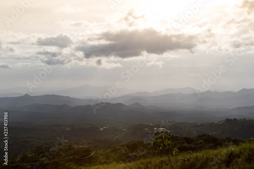 © cratervalley, Naklejka premium Sunset at a moountain range in the central part of Panama looking towards a small mountain village