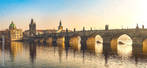Fototapeta premium Sunset at Charles Bridge Panorama, Prague