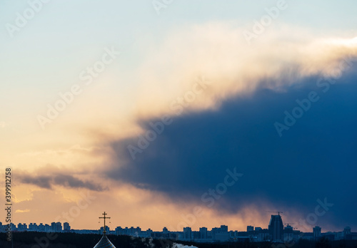 © Maksim Shebeko, Fototapeta premium Sunset at city with building silhouette