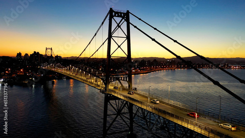 © bydronevideos, Obraz premium Sunset at Florianopolis Bridge. Santa Catarina Brazil. Sunset at cityscape of downtown Florianopolis state of Santa Catarina Brazil. Tropical island. International travel destinations.