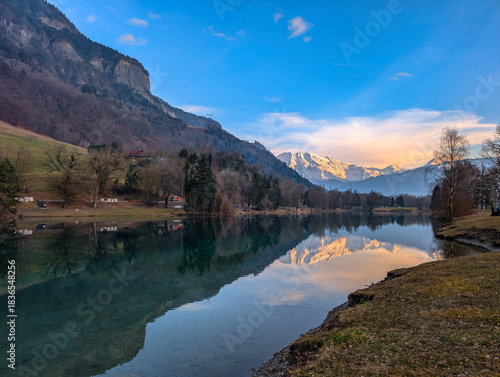 Fototapeta premium Sunset at Lac Des Ilettes lakes near Passy, France