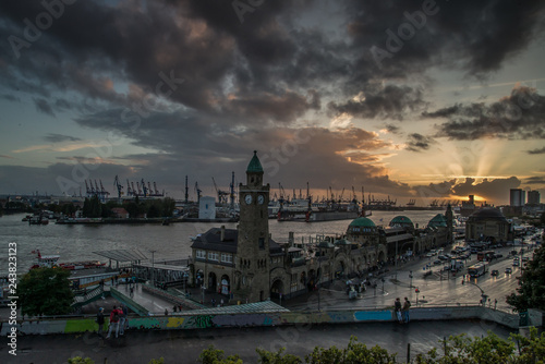 © Andrea, Fototapeta premium Sunset at Landungsbrücken
