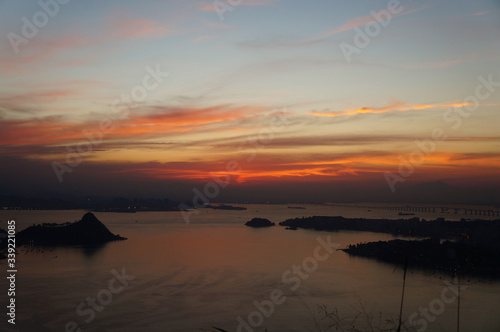 Naklejka premium Sunset at Niteroi and Rio de Janeiro cities, Brazil. View of tourist spots in...