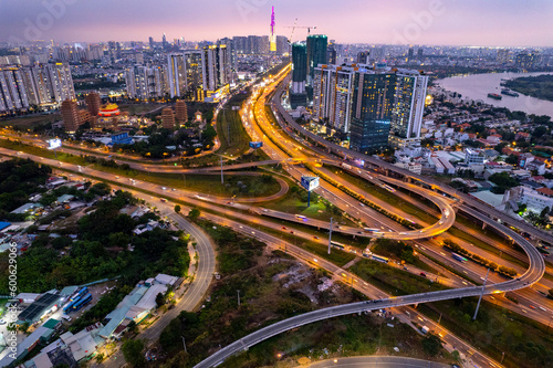 © Moon Cactus, Fototapeta premium Sunset at overpass bridges in Cat Lai juntion, Ho Chi Minh city, Vietnam. Photos taken in April 2023.