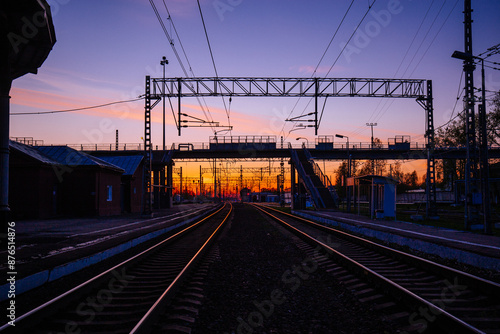 © Mulderphoto, Fototapeta premium Sunset at railway station in Small Vishera, Leningrad oblast