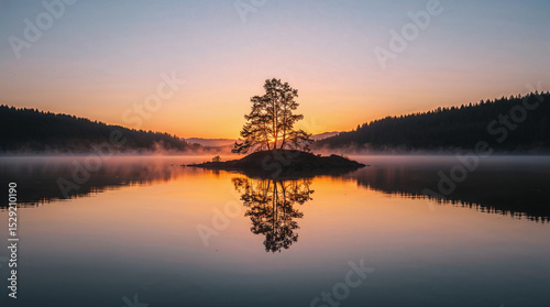 © Aljrov, Fototapeta premium Sunset at Still Lake with Clear Reflections