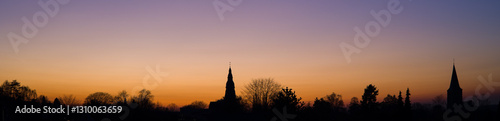 © mschauer, Obraz premium sunset at the blue hour with the panorama skyline of the two churches of ratingen homberg with colored sky