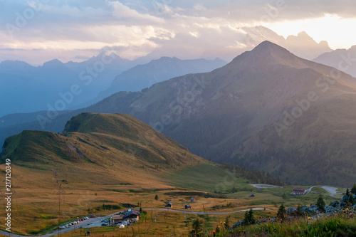 Naklejka premium Sunset at the Passo di Giau, in the Italian Dolomites, on a late July evening.