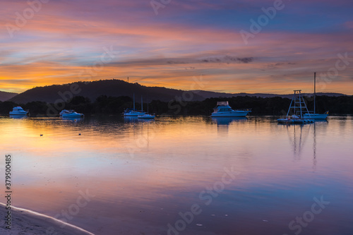 © Merrillie, Naklejka premium Sunset at the waterfront with high cloud and boats