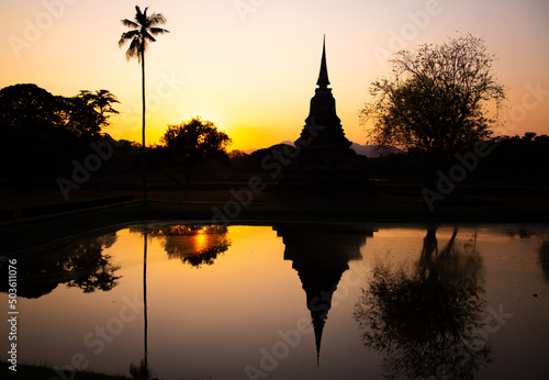 © pierrick, Fototapeta premium Sunset at Wat Mahathat buddha and temple in Sukhothai Historical Park