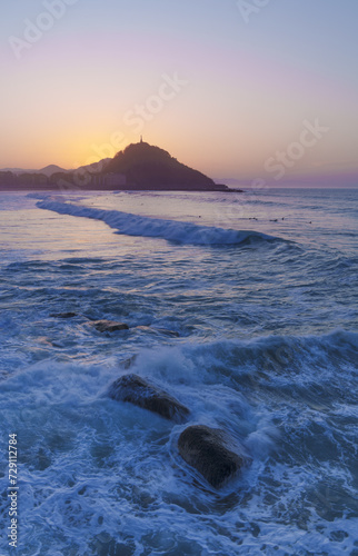 Naklejka premium Sunset at Zurriola beach. Sunset on Mount Urgull and Zurriola beach, City of Donostia San Sebastian.