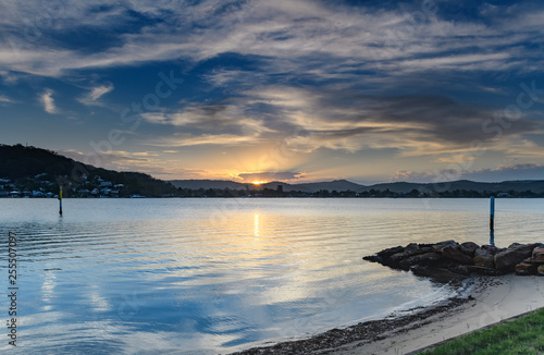 © Merrillie, Fototapeta premium Sunset Bay Waterscape with High Clouds