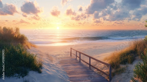 © Zeva, Obraz premium Sunset beach boardwalk dune pathway ocean waves