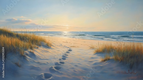 © Berkah, Fototapeta premium Sunset Beach Footprints Leading Towards Ocean