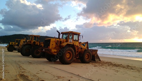 Obraz premium Sunset Beach Scene with Front-End Loaders Industrial Stillness Amid Natural...