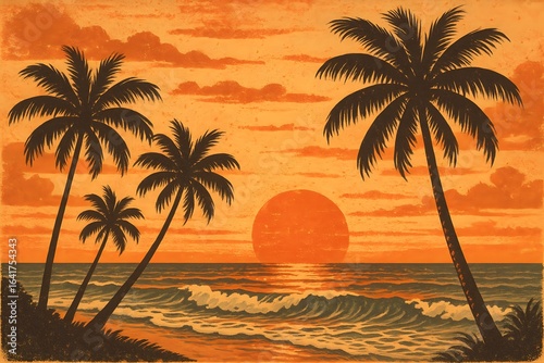 Obraz premium Sunset beach with palm trees and ocean silhouette