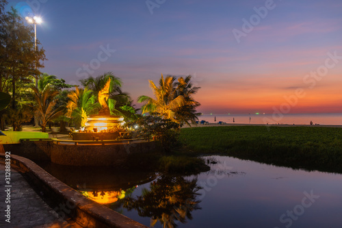 © Narong Niemhom, Fototapeta premium sunset behind golden dragon statue on Karon beach Phuket Thailand