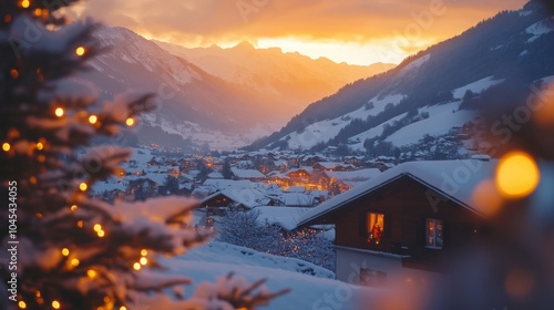 Fototapeta premium Sunset behind snow-covered mountains with a Christmas village glowing in the valley below.