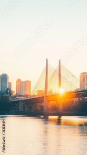 © Lion, Fototapeta premium Sunset behind urban bridge and skyline with warm glow over river