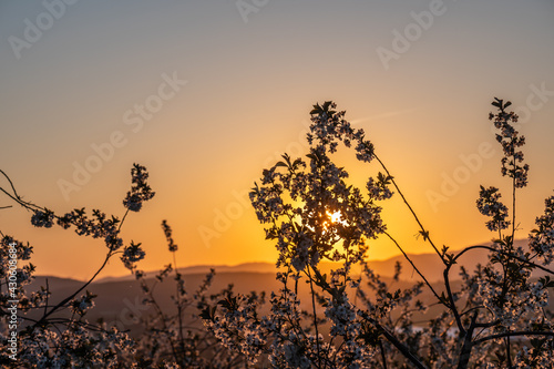 Obraz premium sunset behinde cherry blossoms