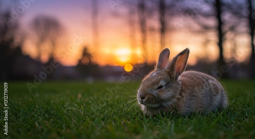 Fototapeta premium Sunset Bunny in Grassy Park - Peaceful bunny resting in a park at sunset, symbolizing tranquility, nature, Easter, springtime, and peace