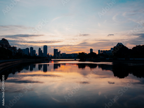 © shurong, Fototapeta premium Sunset by the Kallang River in Singapore. Silhouette of residential apartment buildings in the background.