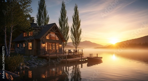 © sarina, Fototapeta premium Sunset Cabin Lake Escape.