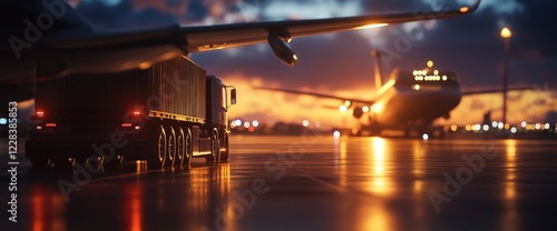 Naklejka premium Sunset cargo plane airport, truck loading, logistics
