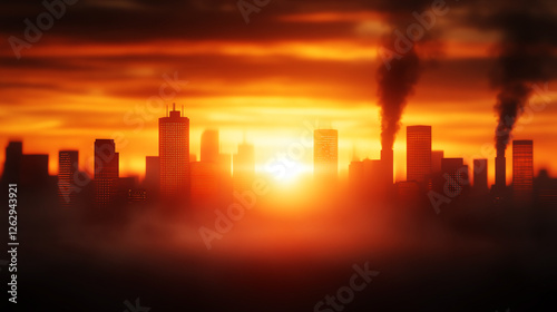 © Anatthaphon, Naklejka premium Sunset casts fiery glow over silhouetted city skyline with smoke plumes rising, highlighting urban pollution.
