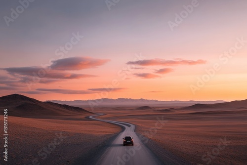 Fototapeta premium sunset casts orange hues across endless winding highway as lone car journeys towards horizon beneath vast sky filled