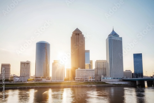 Obraz premium Sunset casts soft light over Rochester's skyline along the river in Minnesota during summer