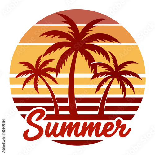 © Background, Naklejka premium Sunset Circle with Palms and “Hello Summer” Script in Smooth Vector Style