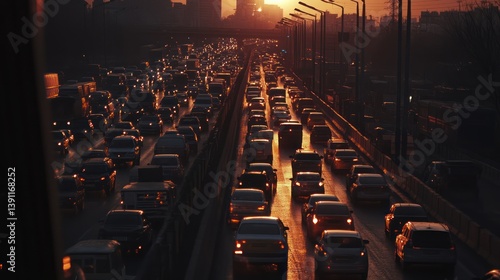 © akun, Obraz premium Sunset City Traffic Jam Commute