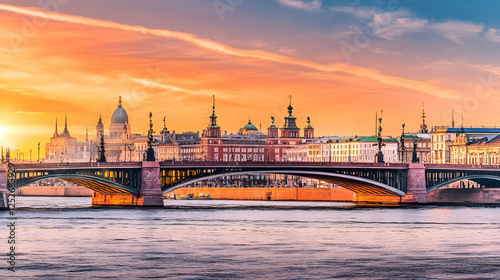 © Siasart Stock, Fototapeta premium Sunset Cityscape Bridge Illustration