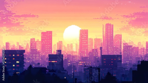 Fototapeta premium Sunset cityscape, buildings illuminated, peaceful evening, urban skyline, digital art, website background