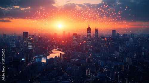 © nurul, Fototapeta premium Sunset Cityscape: Connected Metropolis at Dusk